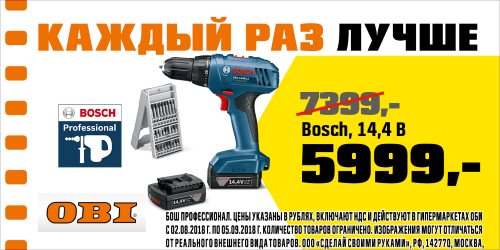 Официальный сайт каталога товаров ОБИ - просто находка! Основное превосходство - это не просто гипермаркет товаров для дома, но и громадный склад, в котором дозволено обнаружить дословно всё - и легкой шуруп, и хрустальную люстру. Ещё одно неоспоримое превосходство в том, что множество магазинов работают круглосуточно. То есть не необходимо никуда спешить, мчаться на кассу, роняя покупки, непрерывно прислушиваться к голосовому информатору, оповещающему о скором закрытии. На официальном сайте каталога товаров OBI я приобретаю предпочтительно товары для ремонта и сада. Начиная от инструмента и заканчивая газонокосилками. Цены абсолютно демократичные, а на ходовые товары зачастую дозволено обнаружить чудесные скидки. По поводу качества сервиса. Могу сказать только отменное. Операторы-консультанты неизменно приходят на выручку, и помогают подобрать то, что необходимо. Либо обнаружить какую-то мелочь, которая то и дело ускользает от взгляда. Конечно же, на все товары предоставляется официальная ручательство, что выигрышно отличает данный магазин от какого-либо строительного рынка. Помимо того, неподошедшее либо лишнее, а также купленное по невнимательности, принимают обратно без вопросов. Широкий выбор и надёжность - вот основные преимущества данного магазина.